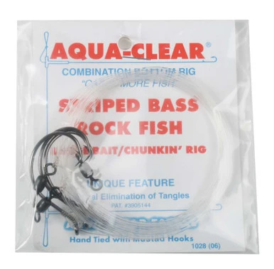 The Aqua-Clear ST-8-3 is ideal for targeting striped bass, black drum, bluefish and more. Featuring snelled 8/0 nickel circle hooks, barrel swivels, and 48 inches of premium leader, the ST-8-3 is a combination bottom fishing rig for both medium sized live bait and chunking applications.