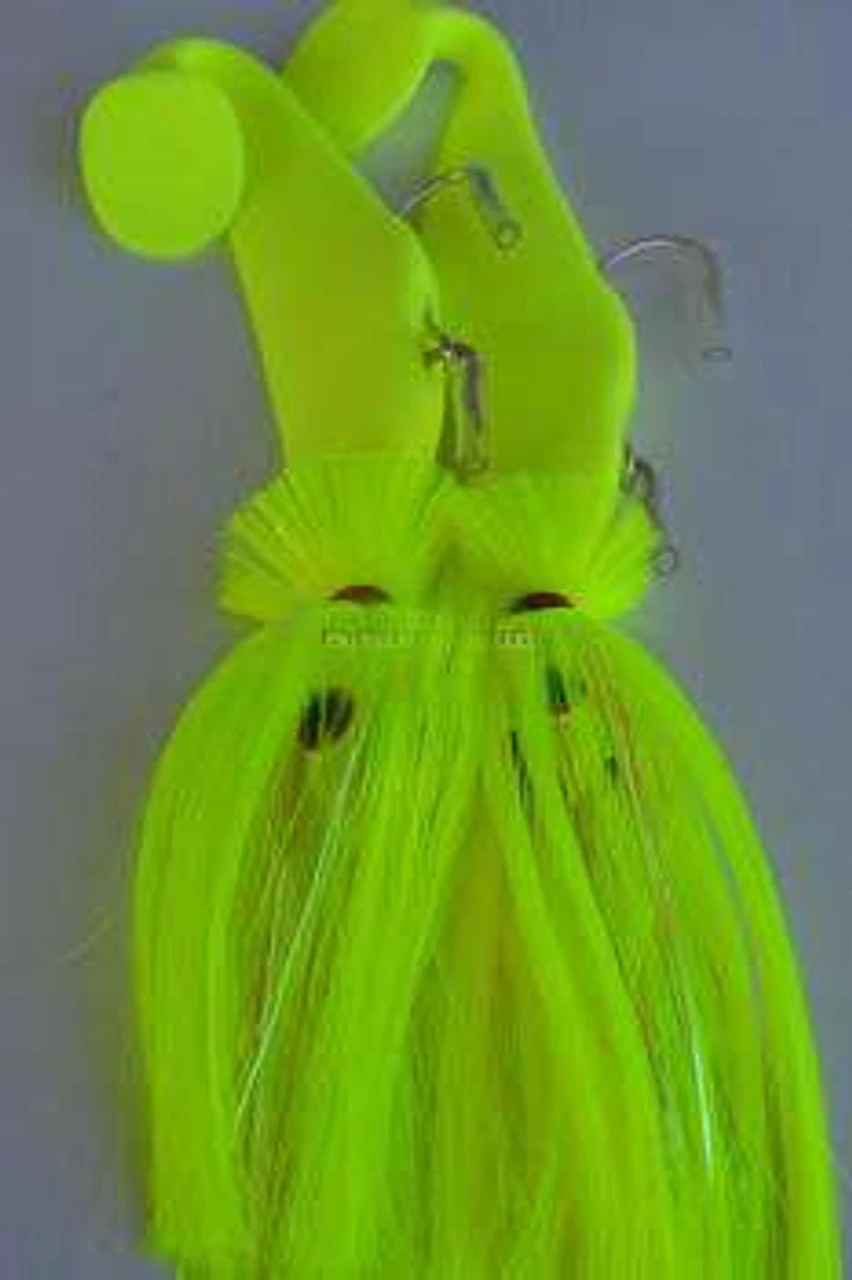 The Blue Water Candy Tandem rigs are rigged on 100# mono with 3-way swivel and a 4′ and 14′ drop back. Double hooked 9″ shad included. They are designed for striper fishing.