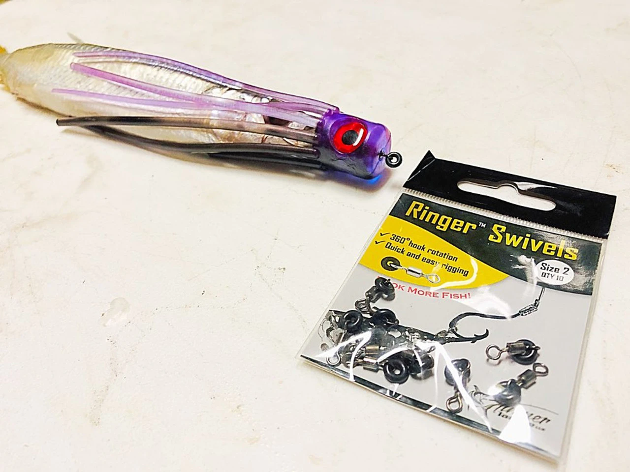 Ringer Swivels are most commonly rigged with ballyhoo when targeting billfish with circle hooks. The o-ring is perfectly sized to accept the industry standard circle hooks, allowing you to quickly change out baits like years past with o-rings with the added benefit of 360 degree rotation provided by the swivel. The added rotation will no doubt help you to increase your hook up ratio out in the deep!
